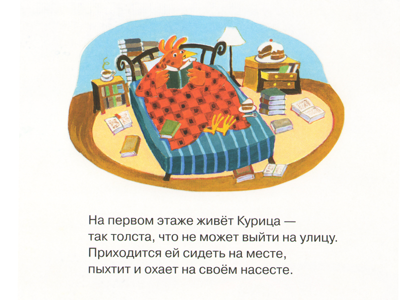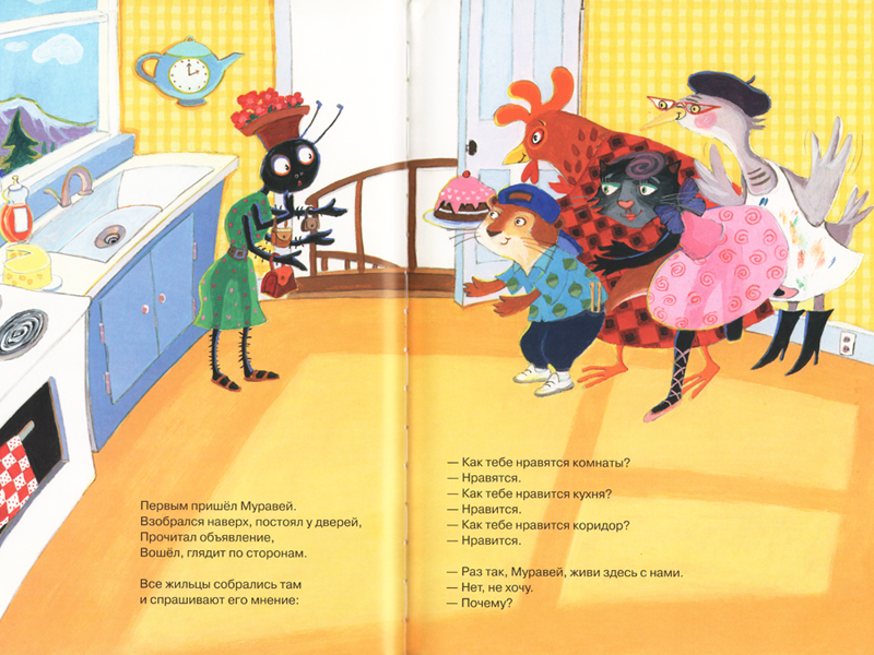 На первом этаже дома, придуманного Леей Гольдберг, живет толстушка Курица. На втором – непоседливая мамаша Кукушка. На третьем – кокетка Кошка. На четвертом – Белочка, любительница орешков. А квартира на пятом опустела и сдается в аренду. Претендентов на нее немало. Вот Муравей пришёл. Всё вроде бы ему по вкусу, кроме… соседки с первого этажа. Разве может такое трудолюбивое насекомое жить рядом с лентяйкой-наседкой?!