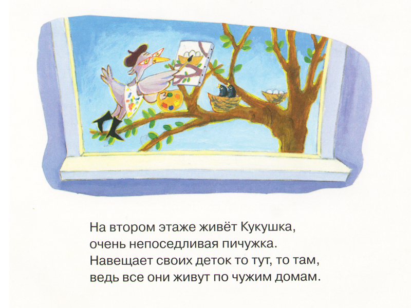 Пятым жильцом становится Голубка – такова уж примиряющая роль голубей в мировой культуре. Она пьёт чай с Курицей, гуляет с Кукушкой, танцует с Кошкой и играет на барабанах с Белкой. Гармония мира восстановлена, все пять этажей дома заселены: «Соседи, каждый в своей квартире, живут в нём доныне, в дружбе и мире».