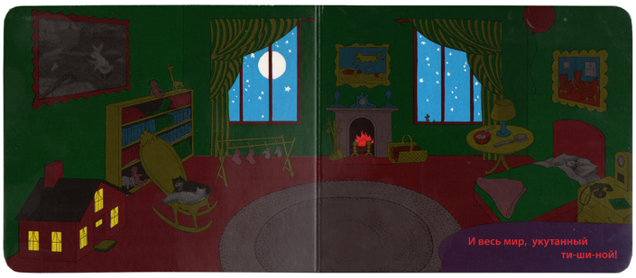 Английский вариант текста – это прощание с окружающим перед сном. Автор за маленького читателя говорит всему, что видит, «Спокойной ночи!»