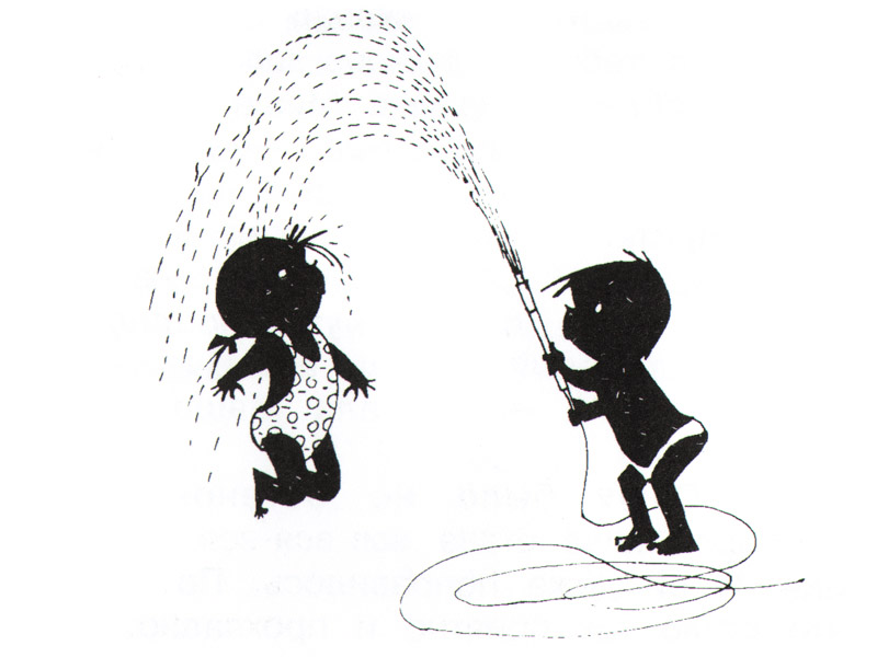 Да, внутри каждой истории «хорошее поведение» героев вдруг дает какой-нибудь маленький «сбой»: начали играть в доктора – не смогли договориться, как доктор должен себя вести; по дороге к дедушке от каждого яблока откусили по кусочку – чтобы выяснить, какое самое вкусное; стали в жару обливать друг друга из шланга – и облили кошку.