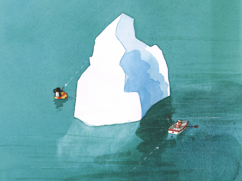 Мальчик поспешил обратно к Южному полюсу, но пингвина уже нигде не было. Оказывается, он поплыл вслед за мальчиком, приспособив в качестве лодки раскрытый зонт. Читатель сможет испытать целую бурю эмоций: отчаяние, когда герои потеряли друг друга из вида, и необыкновенное счастье, когда они снова встретились. Это сцена без слов. На рисунке изображено, как мальчик и пингвин замерли, обнявшись.