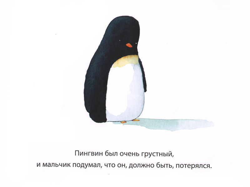 По возвращении домой пингвин почему-то стал еще печальнее. И только тогда мальчик понял, что пингвин вовсе не потерялся. Он выглядел несчастным, потому что страдал от одиночества и не мог найти себе друга. Что же помогло мальчику сделать это важное открытие? После расставания с пингвином он вдруг тоже почувствовал себя одиноким.