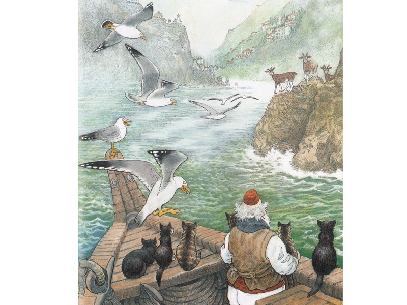 И хотя капитан Кошкин очевидно в летах – седой и с белой бородой, внутреннее его сходство с ребенком налицо. И ребенку легко с таким героем отождествиться. Тем более что капитан Кошкин невысок ростом и вполне органично смотрится в окружении кошек. (Кстати, матросы, которые упоминались на первой странице, совершенно исчезают из повествования. В свои «некоммерческие» плавания капитан отправляется исключительно в кошачьем обществе.)