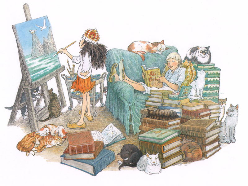 Поскольку Инга Мур по обыкновению рисует (и словами, и красками) нечто напоминающее райскую жизнь, никаких проблем с кормлением кошек или, к примеру, с кошачьими драками в сказке нет. Кошки вместе с капитаном составляют идеальное сообщество – каким мог бы представить его ребенок, не слишком отягощенный жизненным опытом и реальными тревогами: как он сидит, обложившись «компанией» мягких игрушек и рассматривает картинки, о чем-то грезит-играет. Что бы он ни придумывал, какие бы виражи не совершала его фантазия, в основе все равно лежит чувство психологического комфорта и защищенности. Это очень важное свойство психики: воображение продуцирует собственную богатую реальность, когда его не блокирует реальность «первого плана», когда ребенку (и взрослому) не надо перенапрягаться в столкновении с внешними раздражителями.