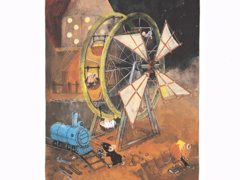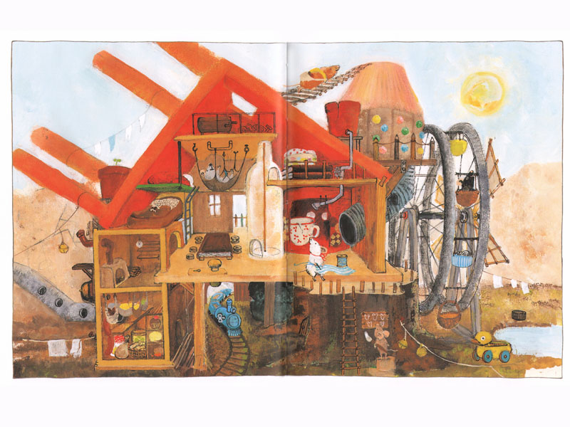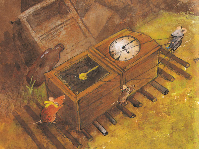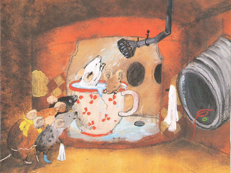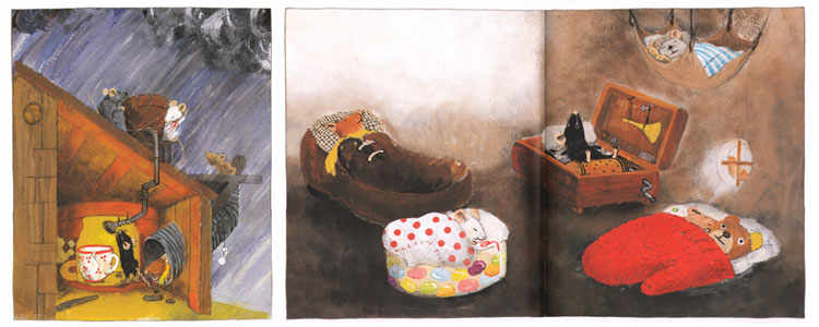 Так, испорченные часы стали кухней и кладовой, забытая книга превратилась в обеденный стол, катушки от ниток – в стулья. В потертый цветочный горшок теперь собирается дождевая вода для купания, а чашку с отколотым краем приспособили под ванну. И спят мышата: кто в ботинке, кто в мыльнице, кто в варежке, кто в гамаке из выцветшей тряпицы, а кто и вовсе – в музыкальной шкатулке.
