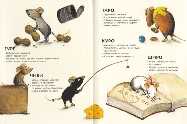 Перед началом истории Чисато Таширо знакомит читателей с героями. Прямо на переднем форзаце книги – портреты пятерых мышат и их краткая характеристика.