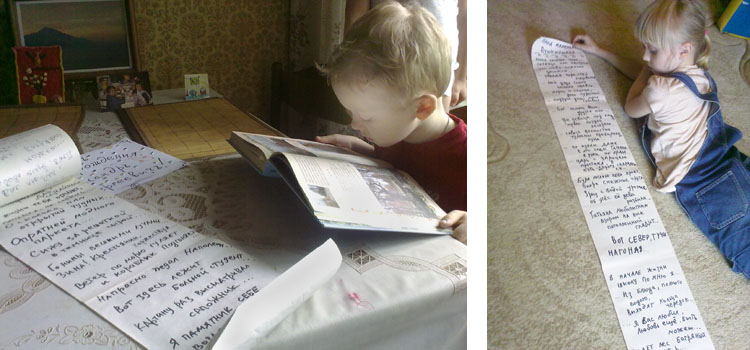 Сначала, конечно, из нас посыпались пушкинские сказки – и белка, и кораблик, и «пушки с пристани палят». А дальше почему-то в огромном количестве «Евгений Онегин» – от картин природы до страданий Татьяны. И взрослое участие (мое то есть) в этом «онегинском» узле ассоциаций было не таким уж и большим. Аня не переставая декламировала про Татьяну, изредка подключался Макар. Продолжили традиционным «Мороз и солнце, день чудесный…» и «Буря мглою небо кроет…». Хорошо, что мы почти сразу сообразили записывать хотя бы первые строки на листы бумаги и склеивать их в длинную полоску. Когда первый энтузиазм от новой игры поутих, и строки вроде бы кончились, эта полоска, стремительно удлинявшаяся, снова пробуждала желание играть. Макар не растерялся, вытащил из «детского шкафа» толстенный том, раскрыл на нужной странице и каждый раз, когда подходила его очередь, читал из пухлого тома. Аня была великодушна – ну и что, он маленький, ему можно. А мы с ней сражались на равных. Я начала заметно уставать и напрягаться, припоминая очередные строки. А Аня раскраснелась, как от быстрого бега, и не отставала. Наш меньшой, двухлетний Митюшка, сидел в кресле, с удивлением глядя на необычную игру, и норовил чем-нибудь тоже оставить свой след на все удлиняющейся стихотворной ленте. Скоро она перестала умещаться на столе и сползла на пол. И заняла почти весь ковер! А, между прочим, давно уже было пора идти на прогулку.