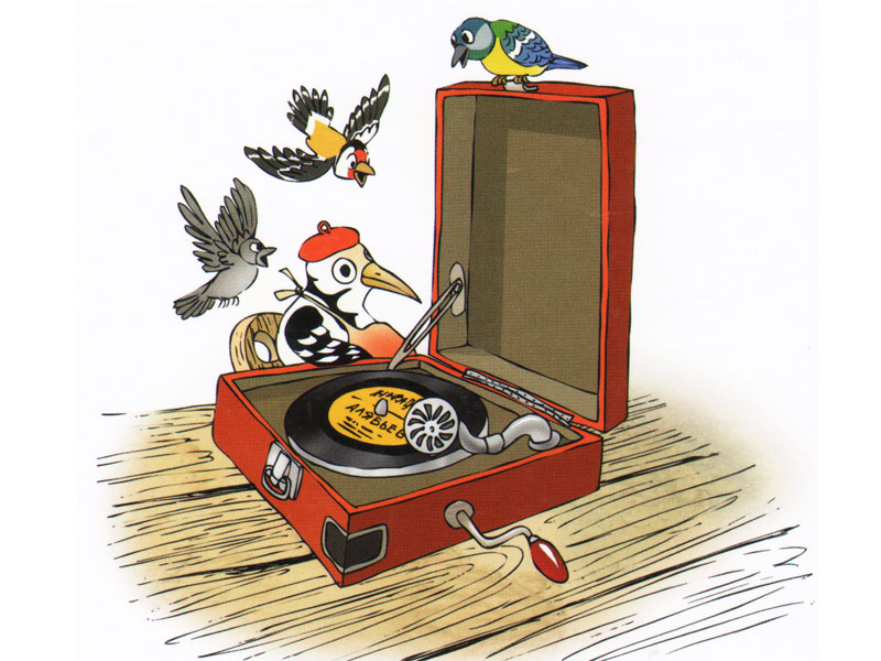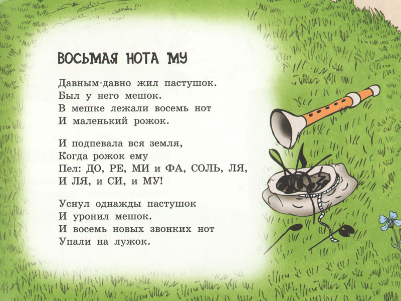 И увлекательная. Про каждый инструмент рассказывается коротенькая история, сюжет которой подробно и неожиданно «разрабатывается и дорабатывается» в смешных картинках Александра Зудина. Поэты рассказывают о пастушьем инструменте йодль, а художник изображает самозабвенно пляшущую на альпийских лугах корову. Поэты рассказывают о волшебном инструменте под названием флейта, а художник иллюстрирует ее волшебные способности, изображая летящую птичью стаю, в которую «затесался» вдохновенный флейтист.