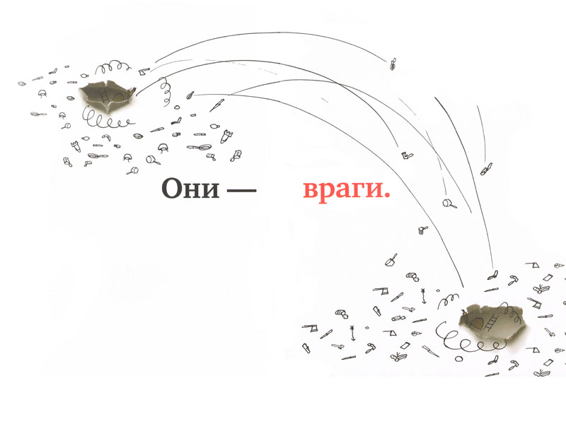 Мы переходим к интерактивной части занятия: обсуждаем, нужны ли вообще войны, что можно сделать, чтобы их не было, чтó для каждого является символом мира. Пока дети рисуют, я думаю о том, что «Враг» ассоциируется у меня с Первой мировой, когда она перешла в состояние «на Западном фронте без перемен», и немножко с Крымской войной, вернее, с тем эпизодом «Севастопольских рассказов», где Толстой предлагает вместо больших баталий устраивать сражение двух солдат, по одному с каждой стороны. От размышлений отвлекает та самая миловидная девочка. Она вежливо интересуется, буду ли я дочитывать книжку. Мое объяснение, что дочитывать нечего, ее не устраивает: «Мы ведь так и не узнали, закончилась ли война!»