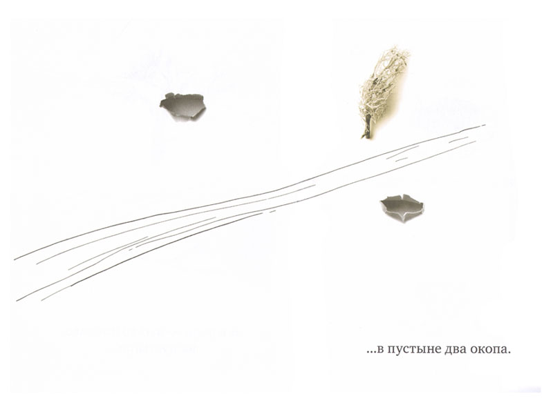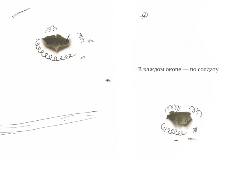Но вот в придуманную жизнь врывается настоящая: среди рисунков мы видим фотографии. Это члены семьи врага. Кто-то первый нерешительно произносит: «Может, враг тоже хороший?» – за следующие несколько страниц это перерастает в утверждение и восклицание. При этом дети чем дальше, тем меньше понимают, где один герой, а где второй на странице. Оба похожи и оба «хорошие»... И вот последний разворот: бывшие враги кидают друг другу в окопы сообщения о прекращении войны в бутылках. Книга заканчивается многоточием.
