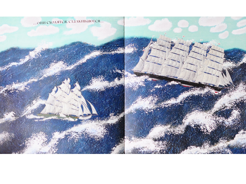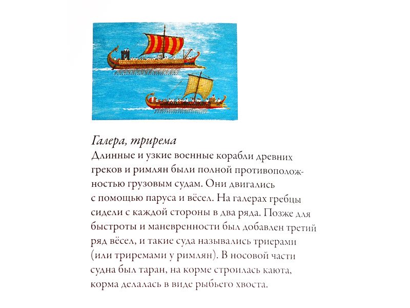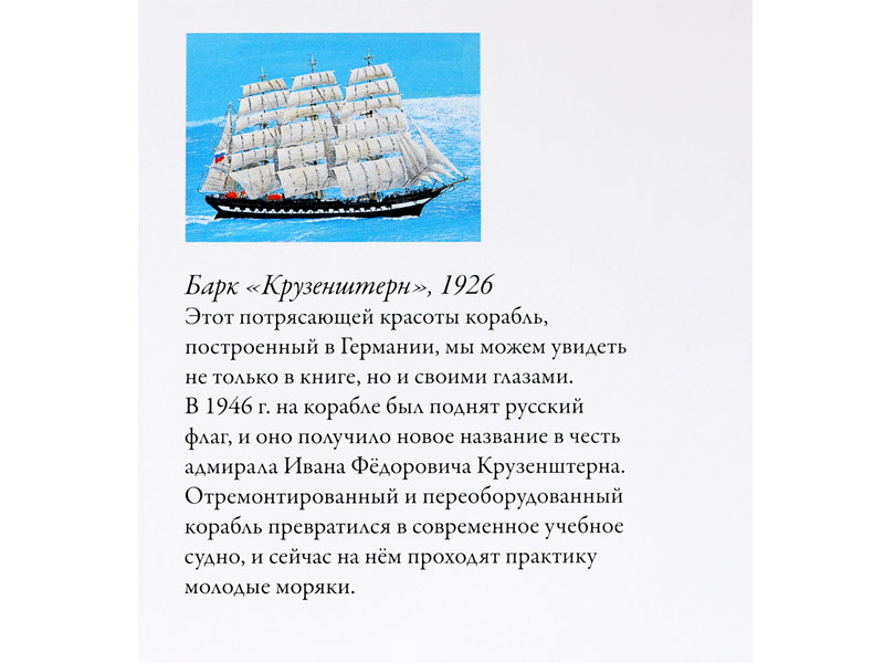 Почему эту книгу можно назвать познавательной? Потому что Михаил Бычков устраивает настоящий «морской парад». С первого до последнего разворота перед читателем проходит целая вереница кораблей, начиная с древнейших галер и трирем и заканчивая современным круизным лайнером. Среди десятков безымянных судов художник изображает и корабли-легенды. Вот в окружении дельфинов плывет к берегам Нового Света каравелла «Санта-Мария». Борется с волнами «Грейт-Истерн», самый большой и быстроходный колесно-винтовой пароход. А вот и «Варяг» с андреевским флагом на борту пробирается через бурю. Все корабли изображены исторически достоверно, а в конце книги приведены краткие сведения о каждом из них.