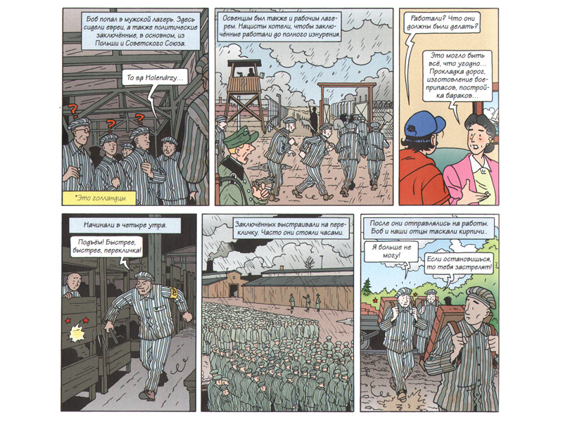 Мои сыновья замечают и обсуждают подробности, кажущиеся необязательными для взрослого: нашивки на немецкой форме, содержимое багажа заключенных. Задаются вопросом, как можно писать в лагере записки, если не было бумаги и ручек. Иногда пытаются скрыть эмоции за деланой бравадой, не выпускающей чувства наружу. И пролистывают страницы еще раз – в одиночестве, наедине с книгой.