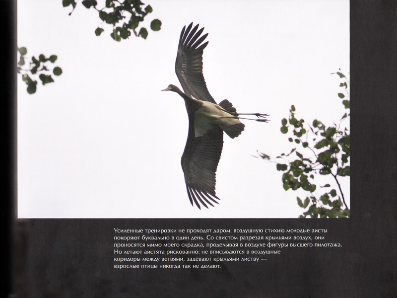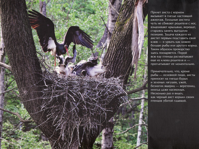 А еще в описании фотосъемки черных аистов есть что-то таинственное, детективное. Только представить: укрытие для фотографа, «скрáдок», устанавливается еще до прилета аистов, в начале весны, – на высоком дереве, напротив аистиного гнезда. Забираться и выходить из скрадка можно только ночью, чтобы аисты не заподозрили, что за ними наблюдают. Наградой за такую конспирацию и стала часть книги, посвященная черным аистам.