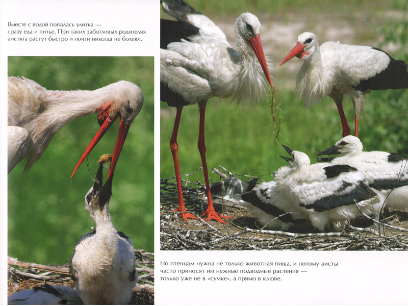 «Расшифровки» иллюстраций порой бывают неожиданны. Вот семья аистов сидит в гнезде, устроенном в развилке старого разлапистого дерева. А рядом – фото каркаса гнезда: как оно выглядело весной, до прилета хозяев из Африки и новоселья. И следом автор дает инструкцию, как помочь аистам соорудить надежный и удобный домик – выбрать правильное место у водоема, найти подходящее дерево-опору, приладить платформу (а вдруг эта книга поможет с жильем какой-то аистиной паре?). Кстати, огромное гнездо белых аистов служит жильем и для мелких воробьев, которые успешно выводят там своих птенцов.