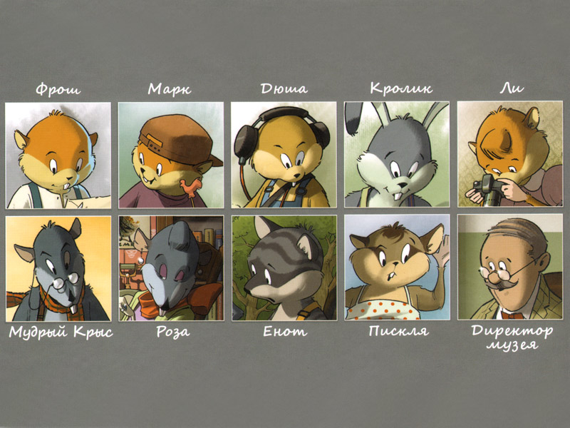 Эти десять маленьких «фотографий» стали для Дениса своеобразным маршрутным листом – по ним он ориентируется в содержании книги. Происходит это примерно так. Во время чтения книги Денис всех останавливает и просит меня показать обложку: «Фрош, Марк, Дюша и Кролик. С ними мы уже познакомились, а с остальными еще нет. Нам еще много читать!» – делает вывод Денис, и мы читаем дальше. Особенно он ждет, когда мы познакомимся с директором музея, ведь его фотография последняя – и значит, книга закончится. А Денису этого не хочется. Важно, что все имена подписаны, и он может прочитать их сам. Я поняла, что так ему гораздо легче ориентироваться в насыщенном содержании книги. А ориентироваться нужно! Ведь рассчитана она на младших школьников, а мы еще младше.