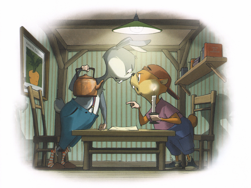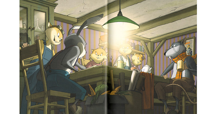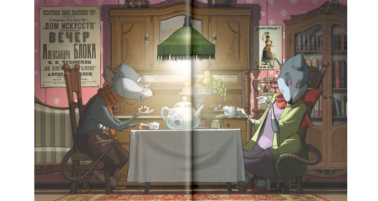 А Лизе понравилась крыса Роза. Если говорить по-взрослому, то Лизу привлекли её оригинальный стиль и яркая индивидуальность. «Роза была натурой возвышенной и утонченной. Она носила шёлковые платья с кружевными воротниками и не расставалась с жемчужным ожерельем, которое ей досталось от матери. Часто прохладными вечерами Роза набрасывала на себя боа из страусиных перьев, и тогда от ее неземной красоты у Мудрого Крыса начинала кружиться голова». История их взаимоотношений довольно печальна. И Лиза им очень сочувствует. Наш любимый разворот – сцена чаепития Мудрого Крыса и Розы. Мы рассматриваем комнату Розы. Я обращаю внимание на театральные афиши, а дети замечают, что Мудрый Крыс как будто что-то держит в руке. Мы присматриваемся и решаем, что он хотел что-то взять, но засмотрелся на Розу и ничего не взял. «Ах…» – вздыхает Лиза.