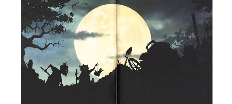 В книге эта ситуация проиллюстрирована большим, довольно мрачным разворотом, который привлек внимание детей: Енот и Пискля заняты раскопками. На фоне огромной луны все происходящее напоминает театр теней и оттого выглядит еще более зловещим, подчеркивая эмоции героев – обиду и разочарование.