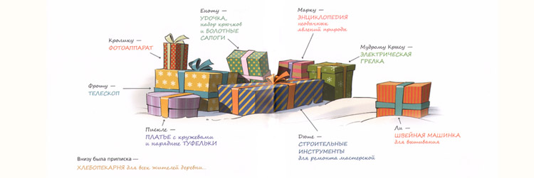 Наступила зима, и мы видим, как Фрош находит много-много подарков. Что в них? Я не стала рассказывать детям, а просто показала им следующую страницу. Все подарки подписаны, и дети прочитали сами. И в этот раз дружба помогла исполниться мечтам!