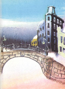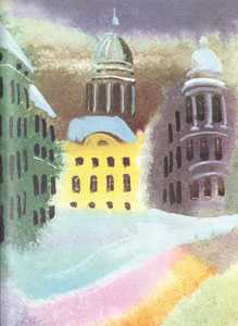 Мы читали издание этой сказки с пронзительными, «тревожными», по словам Федора, иллюстрациями Г.А.В. Траугот. Наверное, Федор волновался за Васю, узнавал в нем себя – и ему было неуютно. И действительно, сердце щемит, когда смотришь на этого большеглазого мальчишку с непослушными кудрями и вздернутым носом и на его хрупкую, тихую, трогательную маму. А еще нам показалось, что в образе безымянного города «просвечивает» родной для художников и для нас с Федором Петербург. Вечерний, заснеженный, с бесконечными, продуваемыми насквозь проспектами, с уходящими в тусклое небо куполами и шпилями.