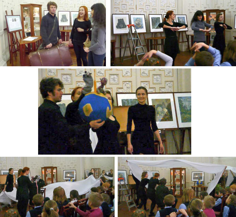 Автор первой сказки – «Сказка Ангела» – народный артист России Андрей Юрьевич Толубеев. Сама книга поступила в библиотеку за пару лет до этого. Волшебные персонажи сказки появились прямо в зале из большого волшебного чемодана. А началось все с традиционной гимнастики кукольников, которая в этот раз проходила вместе с маленькими зрителями. Затем перед глазами ребят предстал Земной шар и на нем – шведская крепость Ниеншанц, появились почти настоящие море и замок, ну и главные герои – кот Брут и мышонок Алексашка.