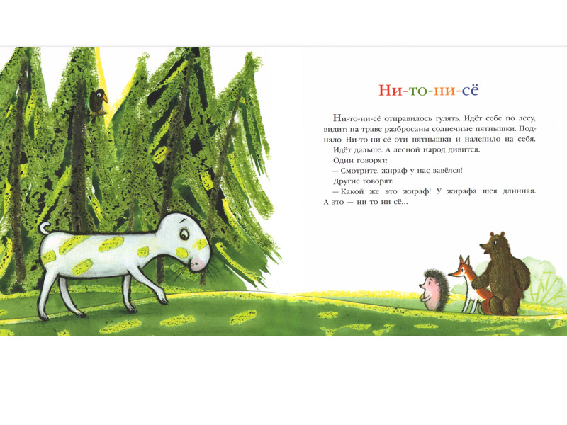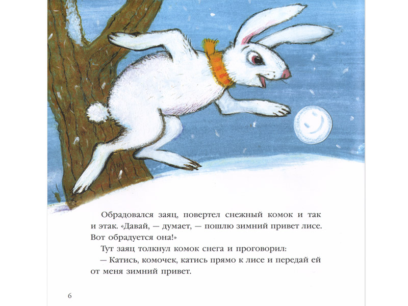 Другая сказка – «Зимний привет» – могла бы считаться веселым образным «введением в диалектику природы». Белка решает отправить снежинку-колесико зайцу в качестве привета, снежинка катится и по дороге становится комком. Заяц отправляет комок лисе, и по дороге комок становится снежным комом. А когда «привет» докатывается до медведя, то это уже снежная гора, которая просто-напросто закрывает вход в берлогу и «обрекает» медведя на безвылазный сон. Зато когда медведь просыпается, никакой горы уже нет. Он вылезает из берлоги, и на носу его сияет весенняя капелька, которая была снежинкой. Такой вот круговорот вещества. Веселые игры природы. Круговое движение событий. Именно так маленький ребенок и чувствует время: оно для него еще не линейно. Главное чувство от прочтения? Радость по поводу жизни, в которой столько всего происходит, но у которой еще нет конца.