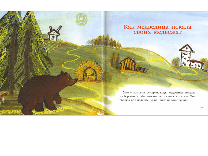 Взять хотя бы одну из лучших сказок писательницы – «Как медведица искала своих медвежат». (Я бы не задумываясь поставила ее в один ряд с «Очень голодной гусеницей» Эрика Карла, даром что «Гусеница» – не просто текст, а еще и произведение книжного дизайна. Но, с точки зрения качества текста, эта сказка Рахиль Баумволь – безусловно, шедевр.) Медведица хочет уложить спать своих медвежат, но их нигде нет. Медведица ищет их в разных «домах» – у зайцев, тигров, львов и т.п., – полагая, что они отправились сказать друзьям «Спокойной ночи!». Но нигде не находит. Она начинает волноваться и тут встречает папу медведя, которому на ум неожиданно приходит мысль: может, медвежата, пока их искали, уже вернулись домой и легли спать? Так и оказывается.