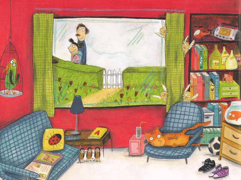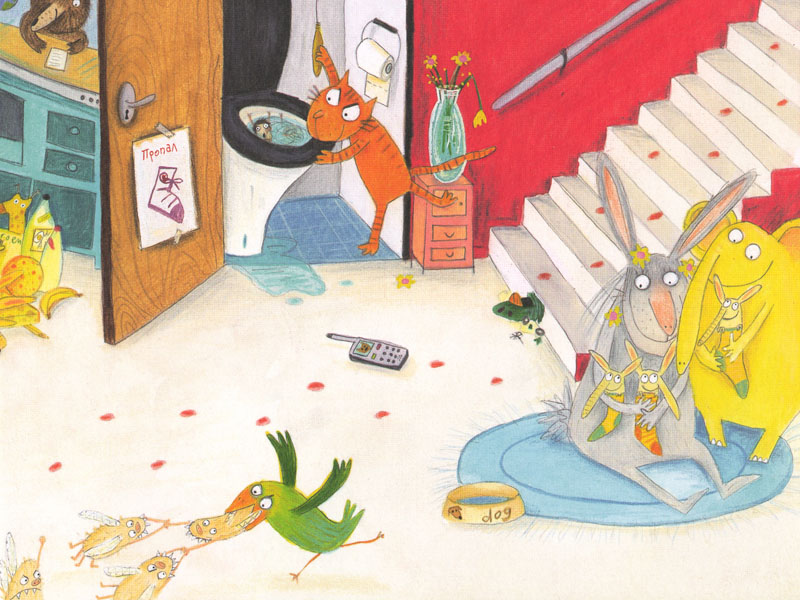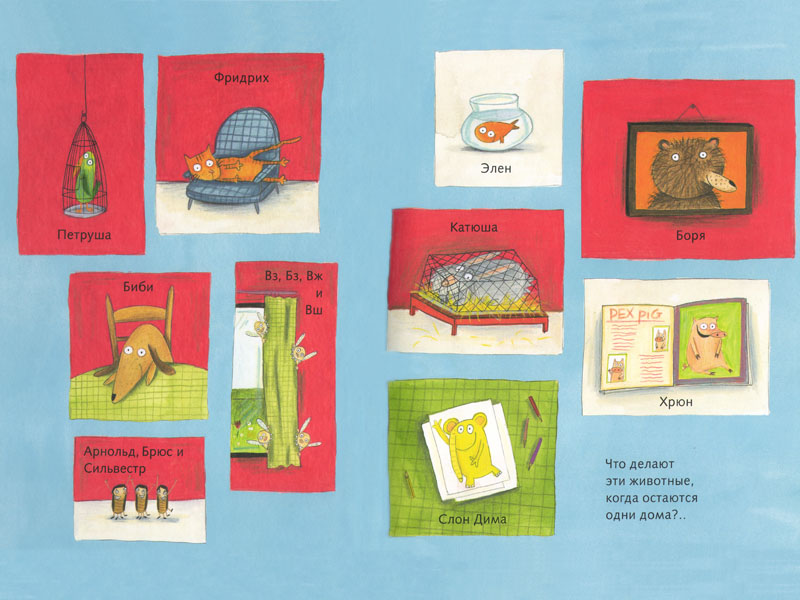 Вот хозяева уходят из дома. В окне видны их удаляющиеся силуэты. В комнате тишина и порядок: кот спит в кресле, задумчивый попугай сидит в клетке, в другой клетке лежит грустная зайчиха. На столе – забытый детский рисунок с желтым слоном. Только тараканы под диваном, похоже, очень радуются. И из-за занавески выглядывают какие-то хитрые зубасто-крылатые чудики (возможно, моль).