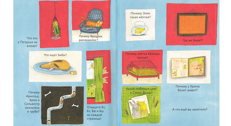 Дальше начинается какое-то веселое безобразие: варенье оказывается на полу, медведь на диване перед телевизором, желтый слон, вылезший из рисунка, бегает по комнате и собирает предметы желтого цвета, зайчиха красит губы, тараканы крадут ботинок, а хрюн в это время… стоп, откуда взялся хрюн? «Перематываю» историю назад. Ага, хрюн вылез из рисунка в журнале! И вот теперь бродит по дому и пробует всё на зуб: цветы из вазы, мячик, кроссовки…. Кто-нибудь, остановите его, он же так все съест! Но никто хрюну не мешает, все заняты своими делами.