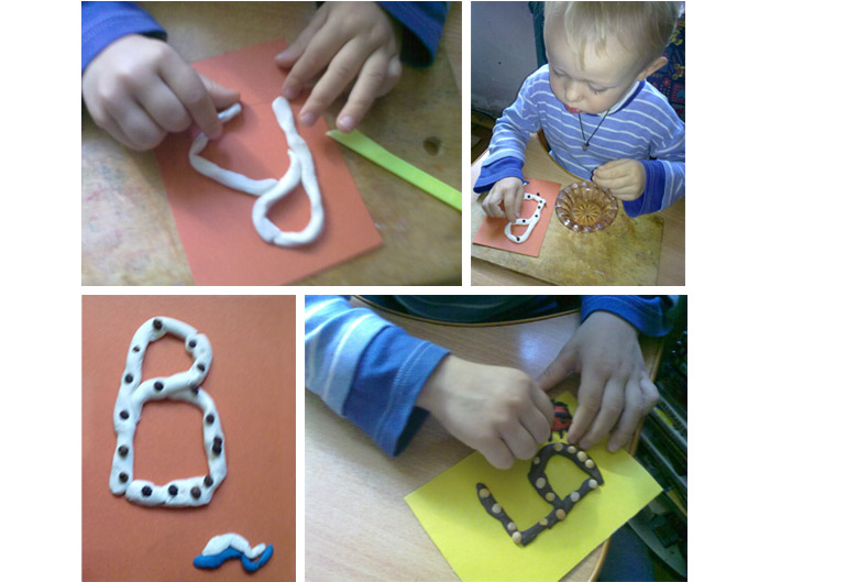 Как-то утром, когда старшие были в школе, я предложила Митюшке немного полепить. Но не привычных колобков и очень голодных гусениц, а буквы. Он удивился, но захотел попробовать.