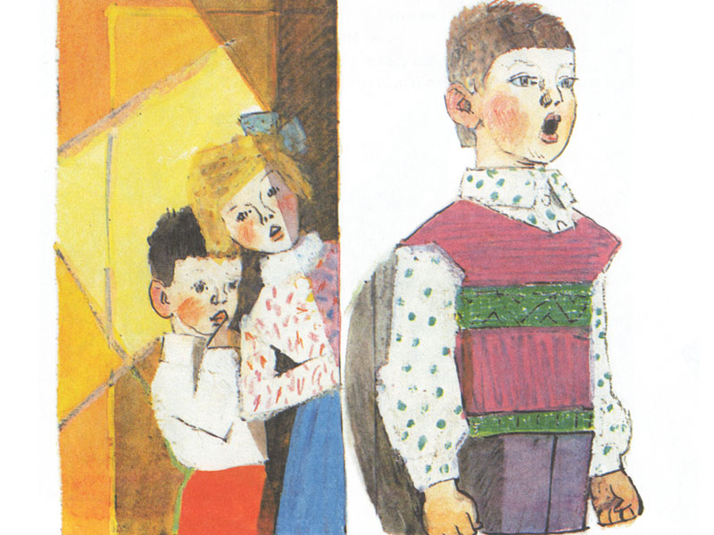 А дальше я читала текст дважды: сначала по одному изданию, потом по другому. Мы несколько раз листали каждую книгу. Я попросила детей определить: кого можно чаще увидеть на рисунках Коровина, а кого – на рисунках Лосина. Вглядевшись, дети легко заметили разницу: Лосин рисует маленьких детей и школьников, а Коровин – взрослых. Почему? О чем же пишет сам Маяковский? Подумав, мальчики нашли ответ: это стихотворение о том, как дети становятся взрослыми, играют во взрослых, мечтают, готовятся к взрослой жизни. «Вот если бы я был художником, – сказал Лёня, – я бы рисовал вместе и ребенка, и того взрослого, в которого этот ребенок превратится».