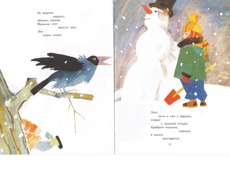 Мы рассмотрели их внимательно. А потом обнаружили, что и в «толстой» книге, с иллюстрациями Ювеналия Коровина, это стихотворение тоже есть. Так у детей появилось новое увлечение, захватившее их на несколько вечеров: сравнивать иллюстрации разных художников к одному стихотворению. Лёня, уже хорошо умеющий читать, читал надписи на обложке: определял имена художников, а потом мы обсуждали и само стихотворение, и картинки к нему.