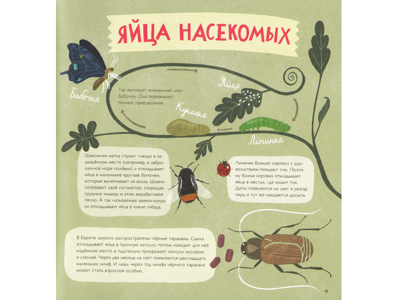 Яйца насекомых не менее удивительны и разнообразны, чем яйца птиц. Пауки прядут для яиц специальные паутинные мешочки. Змеи и ящерицы тоже откладывают яйца, а некоторые из них, например королевская кобра, даже строят гнезда. Икра – и лягушачья, и осетровая ? это тоже яйца. Рыбы и земноводные откладывают их прямо в воду. Даже среди млекопитающих есть яйцекладущие ? например, австралийский утконос. И динозавры тоже откладывали яйца – огромные!