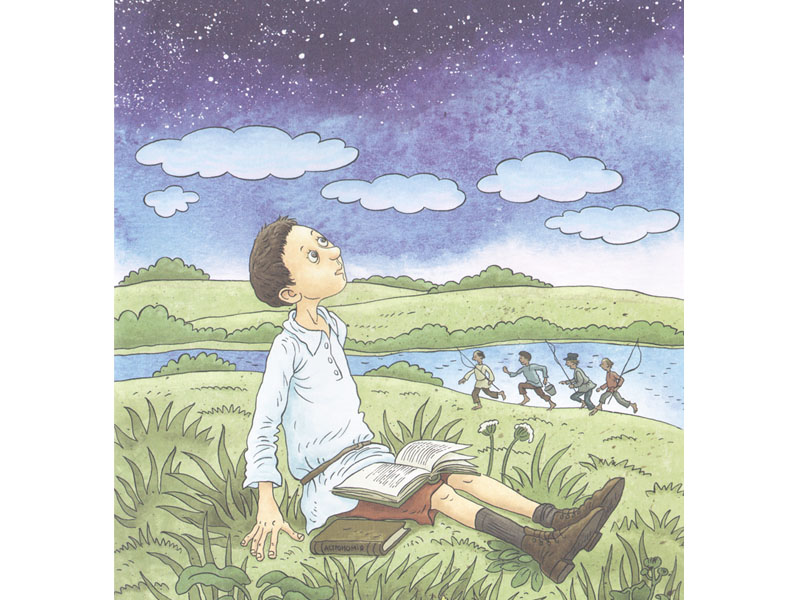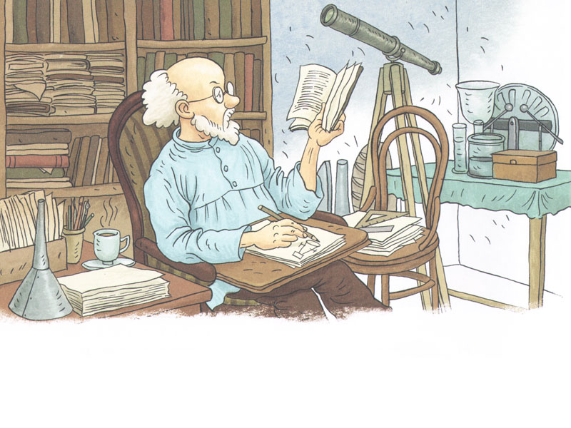 Дальше история совершает неожиданный поворот: вдруг выясняется, что Циолковский был глухим. Слушатели сразу притихают и только спрашивают: «Как же тогда он смог стать ученым?» Мы узнаем о скарлатине, которая дала осложнение на уши, а потом о невероятной воле и тяге к знаниям, благодаря которым юный Костя жил на хлебе и воде в чужой Москве, да еще и учился. Снова книга подсказывает, как ее читать: «Вы, наверное, спросите, а в каком же все-таки институте он учился? А ни в каком!» Спрашиваю ребят, как можно еще учиться, если не в вузе. «По книгам!» – «Верно, а где же брать книги?» – «В библиотеке!» – догадываются читатели.