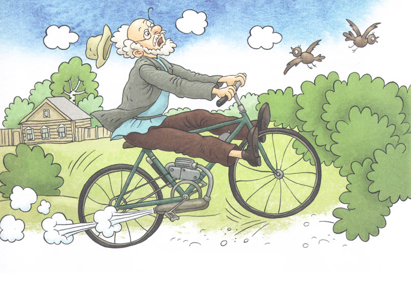 Эпизод с попыткой Циолковского приспособить к велосипеду мотор и превратить его в мотоцикл вызывает живой интерес. Но дети сразу понимают, что ничего хорошего из этой затеи не получится: «Он же поедет слишком быстро!» Предыдущая ‒ серьезная ‒ главка с экспериментами снова сменилась юмористической. После байки о неудавшемся гонщике, автор рассказывает о песнях неслышащего ученого, и моя аудитория смеется над забавными историями и иллюстрациями.