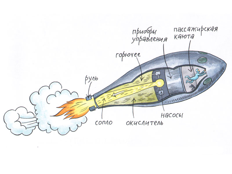 Гротескные, карикатурные иллюстрации Ольги Громовой к этому и следующему развороту тоже всех смешат. Пока я их показываю, дети комментируют: «Да-а, чудак! Вот дуралей!» Тут же начинается обсуждение того, как повторить опыт Циолковского, ‒ на улице осень, но ребята всерьез дискутируют, можно ли проделать то же самое на роликах.