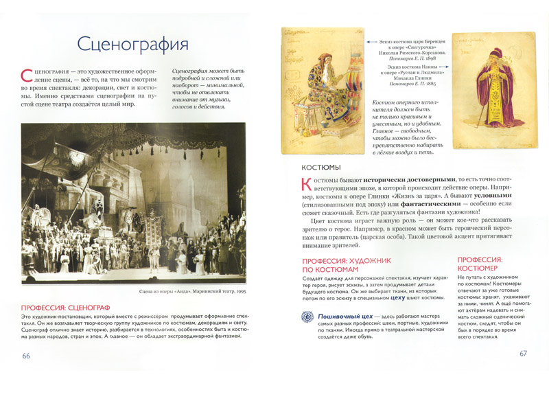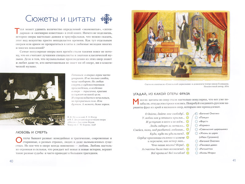 Авторы энциклопедии обращаются не только к разуму и памяти ребенка, но и к его сердцу. Ведь именно для того и был создан театр в глубокой древности, чтобы, по мысли Аристотеля, люди испытывали здесь катарсис («очищение души при помощи страха и сострадания» – так это слово переводится с древнегреческого). «Готовься: в операх герои часто умирают. И не только злодеи, чаще наоборот. Но любая смерть в художественном произведении, а особенно в опере – трагична, красива и служит великой цели. И сопровождается печальным, но прекрасным соло. Или дуэтом. А, может, даже хором». Авторы энциклопедии исподволь готовят ребенка к сложной душевной работе, настраивают на то, что может почувствовать человек во время исполнения оперы. Почувствовать – и не испугаться. Или даже обрадоваться.