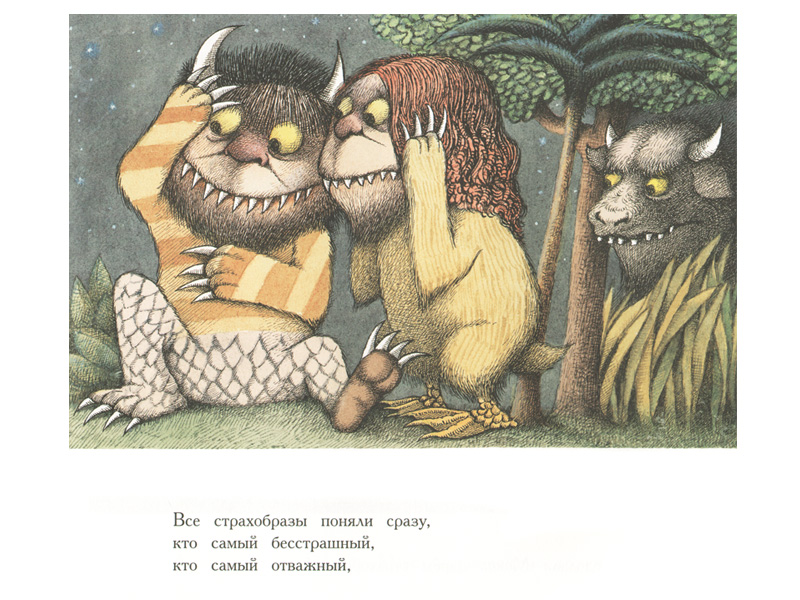 Сендак в свое время давал интервью и объяснял особенности своего творчества. Для понимания «Там, где живут чудовища», на мой взгляд, важно вот это: ««Мне не нравятся сентиментальные образы детей, этаких миленьких деток… Я хотел показать детей такими, какие они есть на самом деле, – но с любовью… Ведь дети никому не желают зла. Они просто еще не знают, что значит «правильно». Или принимают за правильное то, что является ложным. В детском мире царит чудовищная неразбериха!»