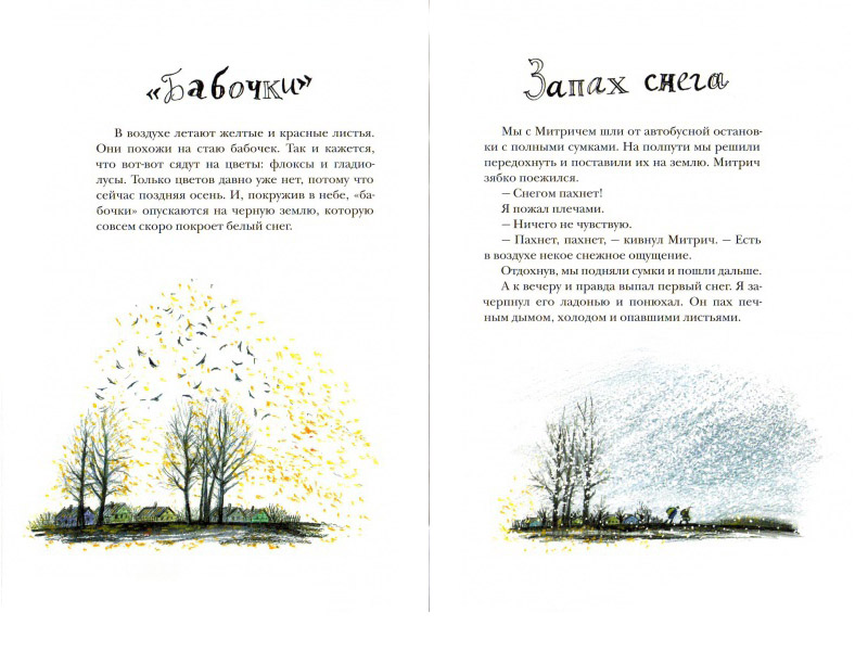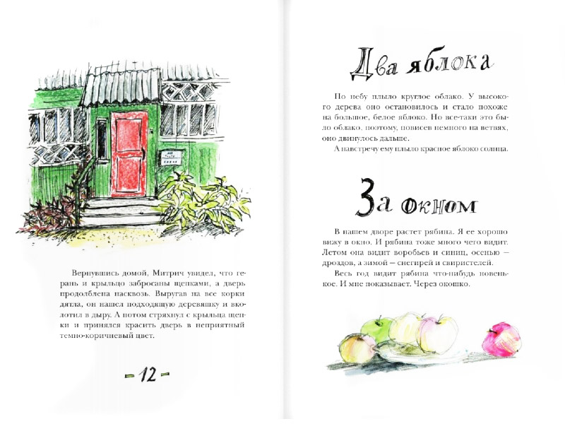 – Я очень благодарна Татьяне Кормер – тогда арт-директору «Самоката» – за возможность сотрудничать с этим издательством: она «увидела» тексты Станислава Востокова и мои рисунки вместе. «Зимняя дверь» – первая полностью моя книжка. Сначала мне хотелось сделать что-нибудь эдакое, выступить креативно, «забабахать». Но это быстро отпустило, когда я вчиталась в текст. Он определил мои решения. Подумала, что эта книга выиграет от «камерного» формата, что в ней должен быть «воздух», много белого. Черно-белая графика соединилась с текстом, и я добавила цветные «паузы» без текста – чтобы остановиться, по-деревенски постоять-подумать. Мне нравится, когда рядом со строгим текстовым блоком появляется рукописный заголовок, – и я это использовала. В переплете попыталась обыграть идею рассказа, давшего название сборнику: «зимняя дверь», а на обороте – «летняя». Дальше – производственный процесс, «обретение тела»; когда книга-идея воплощается в предмет из бумаги, напечатанный красками, сшитый нитками, – это сильные переживания.