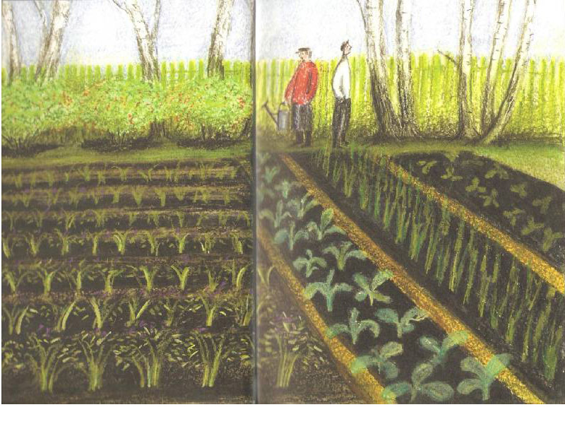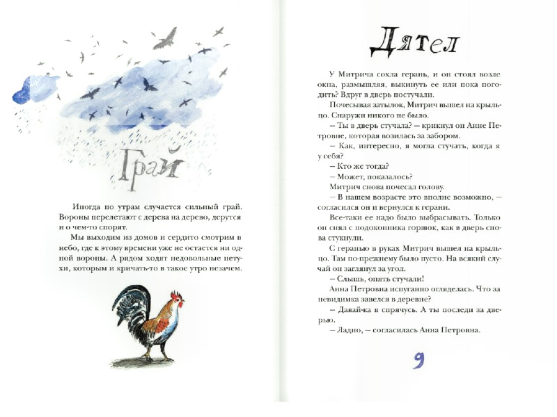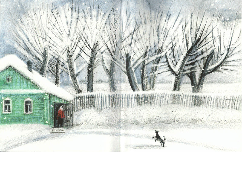 – Конечно, каждый художник узнаваем, но все же профессия иллюстратора предполагает способность понимать и чувствовать текст. Художник должен настроиться на автора. Мой учитель и прекрасный художник-иллюстратор Е.А. Трофимова говорила, что надо влюбиться в то, что ты делаешь. Когда я прочитала рукопись «Зимней двери», поняла, что ничего в себе не придется «переключать». Прочитала и погрузилась в какое-то приятное, медитативное состояние. Востокову удаются и лирический пейзаж, и иронический портрет, и персонажи-животные. Многие эпизоды сразу «раскрылись» картинками, послышались переклички с моим любимым Юрием Ковалем. И ведь я сама немного знакома с русской деревней и представляла себе этот спрятанный от горожанина мир: деревья, коты, огороды, одинокие старички и старушки, вороны, листья, яблоки, покосившиеся домики.