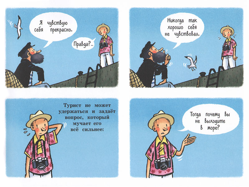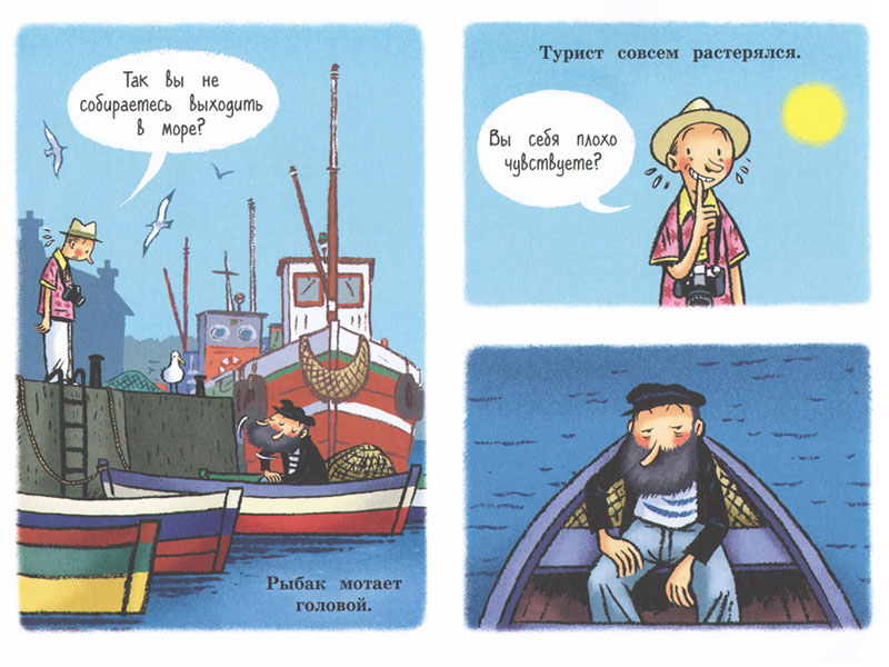 – Книжка совсем не про рыбалку. Она про умного и дурака. Умный – рыбак. Он сделал свою работу и отдыхает. А дурак – турист, который пристает к рыбаку.