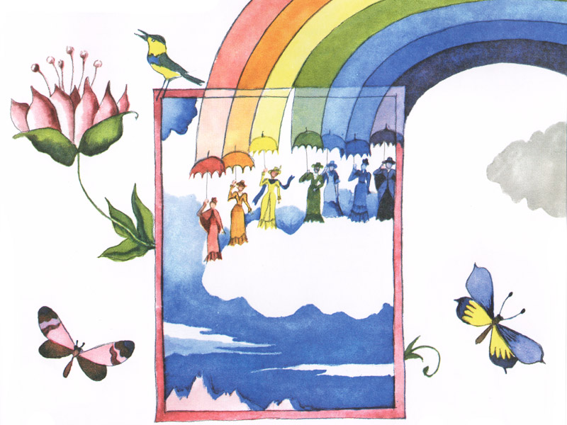 Как жаль, что в детстве я не знала этой книги! Скорее всего, она оказалась бы одной из любимых. Потому что это идеальная книга для читающих девочек 6-9 лет. Все в ней абсолютно прекрасно: и слова, и картинки, и мысли, и чувства. Трудно убрать руку с рельефной обложки, которую хочется все время гладить. Невозможно оторваться от великолепных иллюстраций Виктора Пивоварова (их считают лучшей работой художника в книжной графике). И надолго запоминается удивительный и прекрасный миф о рождении радуги из разноцветных зонтиков семи старушек.