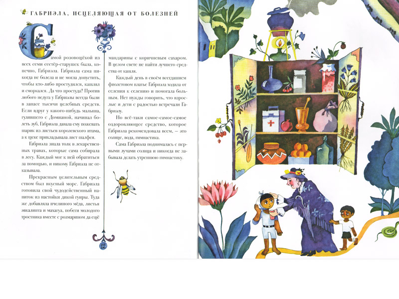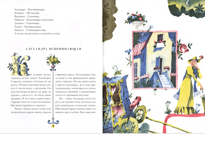 Семь книжных разворотов – семь сестер: Алехандра, Беатриса, Вероника, Габриэла, Домиана, Едвига, Жаннета. Семь первых букв алфавита. Семь цветов радуги: Алехандра носит желтое платье, Беатриса – красную шаль, Вероника – фиолетовую шляпку…