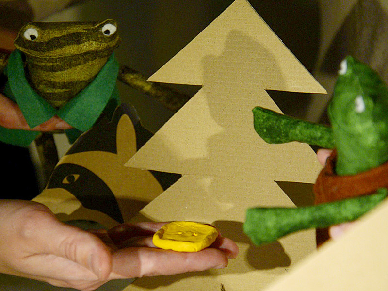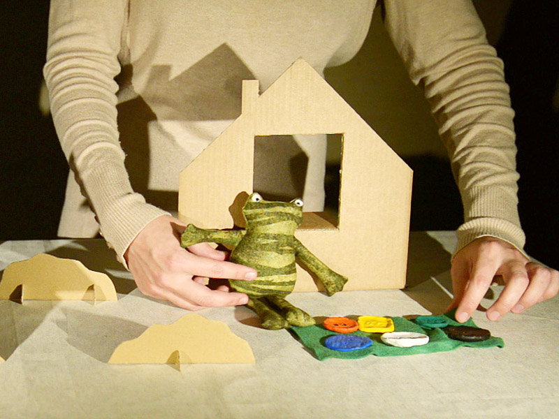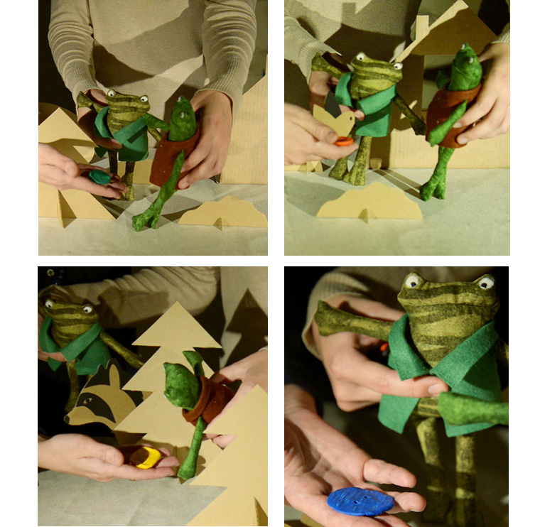 Декорации и второстепенных персонажей мы вырезали из грубого коричневого картона. Нам нужны были пространственные символы, чтобы слегка наметить место действия: дом, пара елок вместо хвойного леса, пучки травы вместо луга и несколько прибрежных камней для обозначения ручья. Второстепенные герои – енот и воробей – выполнены в той же технике, потому что их роль в этой истории сводится к тому, чтобы просто разнообразить эпизоды, где Квак и Жаб находят очередную пуговицу.