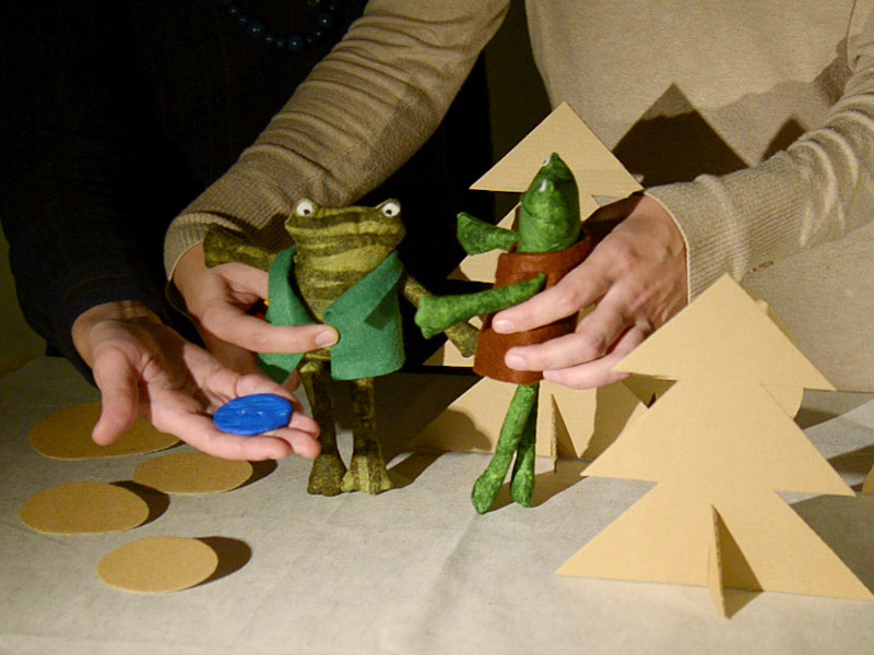 Дальше мы меняем темп повествования и приглушаем свет. Нам хочется, чтобы финал этой истории был трогательным. Вечером Жаб «пришивает» все найденные пуговицы к своей любимой курточке, чтобы подарить ее Кваку (у нас заранее припасена курточка с еще одним комплектом глиняных пуговиц меньшего размера). Жаб качает головой и тяжело вздыхает – ему жаль, что он зря обидел друга.