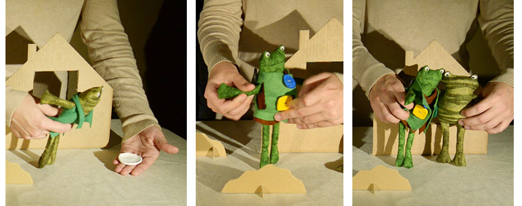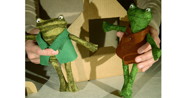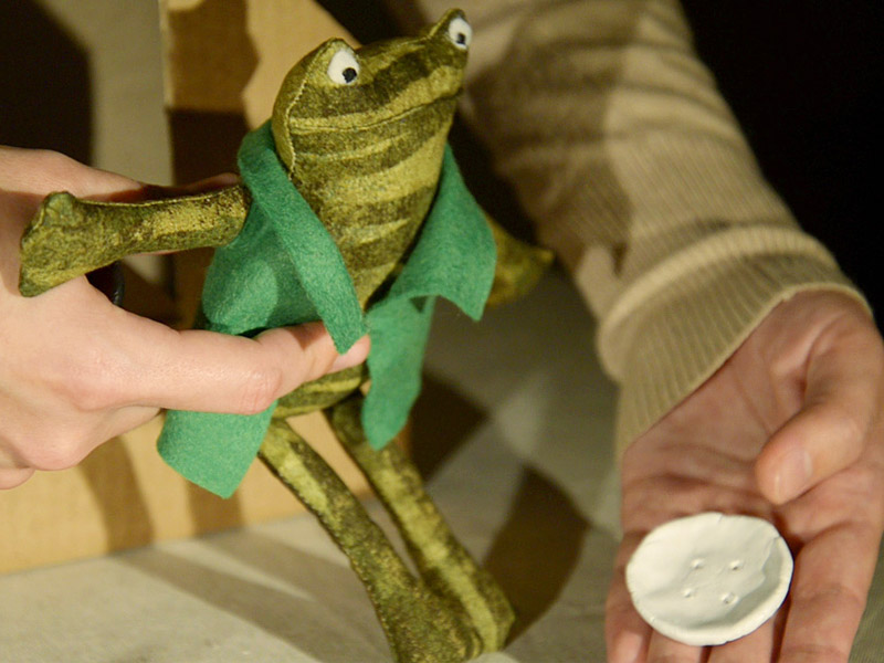 Мы сразу поняли, что лягушек нужно сделать пластичными и гибкими. Куклы здесь не только активно двигаются, но через движения выражают разные эмоции. И за внешностью персонажей должны угадываться их характеры. Поэтому наши лягушки – тряпичные куклы. Ярко-зеленый, астенического телосложения Квак и плотно сбитый, коренастый, тусклый Жаб.