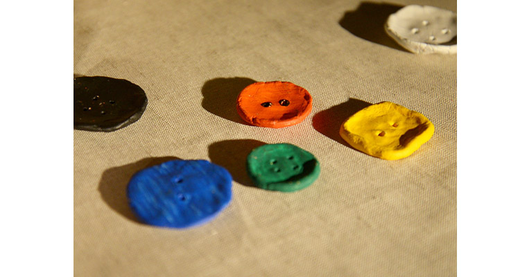 Пуговицы тоже надо было выделить. Мы слепили их из глины, запекли в духовке, а потом раскрасили акриловыми красками. При этом мы в точности соблюли все авторские характеристики насчет цвета, размера, формы, толщины пуговиц и количества в них дырочек. Пуговицы у нас очень большие, чтобы во время спектакля зрители смогли рассмотреть их во всех подробностях.