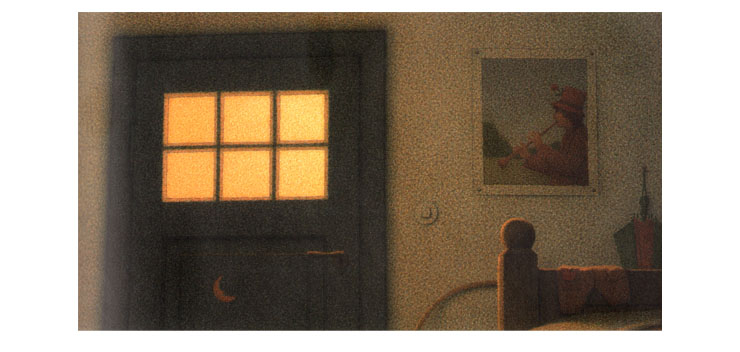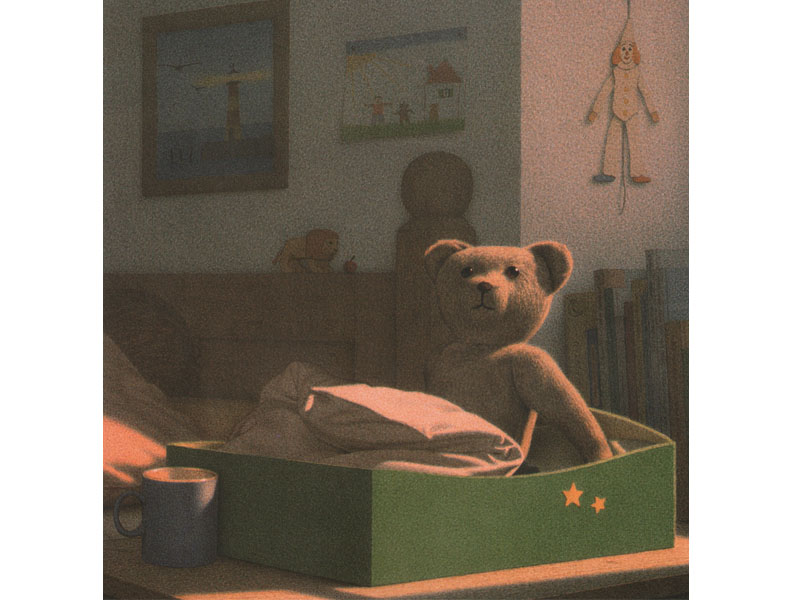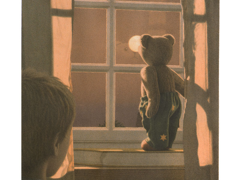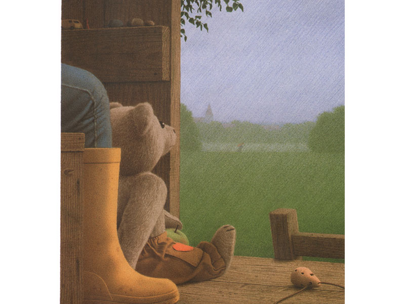 Благодаря искусству Кинта Буххольца малышу может неожиданно открыться радость простых вещей. Возможно, после чтения книги он обратит внимание на шум дождя за окном, захочет посидеть в тишине и поглядеть на падающие капли, похрустывая яблочком, как медвежонок. Кстати, на «дневных» картинках впервые появляется мальчик, хозяин медвежонка. Но он нарисован намеренно неотчетливо – то со спины, то сбоку, то нам видны только его ножки в резиновых сапогах, рядом с которыми уселся медвежонок. У него как бы нет своего собственного лица, так что этим мальчиком вполне мог бы оказаться и маленький слушатель книжки.
