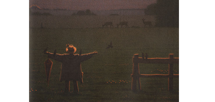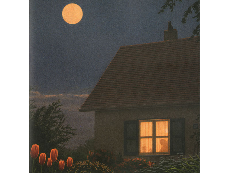 На следующих страницах мы оказываемся в саду, во дворе, на лугу, на берегу реки. Они окутаны ночной мглой, но всюду, как маячки, светятся огоньки в окошках, призванные успокоить и поддержать малыша. А Кинт Буххольц предлагает нам увлекательную игру в рассматривание ночного мира. Художник прячет в темноте косуль и птиц, сидящих на плетеной изгороди, и нужно очень внимательно вглядеться, чтобы заметить их. Это оказывается так интересно, что потом малыш уже сам ищет, нет ли кого-то еще в этих таинственных силуэтах.