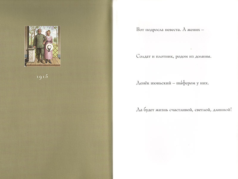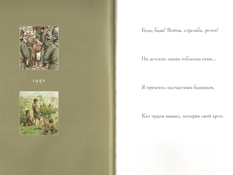 Так мы рассматривали каждый разворот, подолгу изучая детали, сравнивая с предыдущей картиной. Мне важно, чтобы усилия по расшифровке и пониманию визуального текста дети предпринимали самостоятельно. Передать им свое «готовое» знание я всегда успею, а вот учить их самостоятельно мыслить я могу только сейчас, в детстве. Поэтому я все время обращаю их внимание на детали, подробности: «Интересно, о чем говорят эти люди? Не могу понять, чем занят старик…» Часто разгорались споры. Особенно дискуссионной оказалась иллюстрация 1942 года.