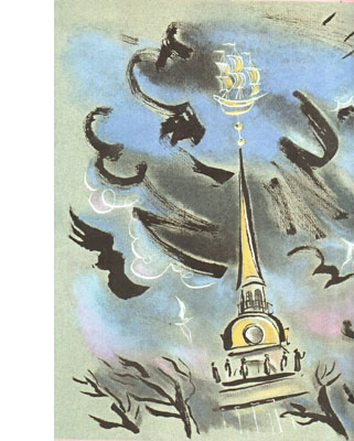 Подумать только, Федор беспокоится, что «нежный» кораблик-флюгер может «раствориться в необъятном небе». Или его унесет штормовой ветер. Или навсегда заслонят собой тяжелые тучи. Но крепкие морские якоря, «стерегущие Адмиралтейство», все-таки должны удержать кораблик на месте.